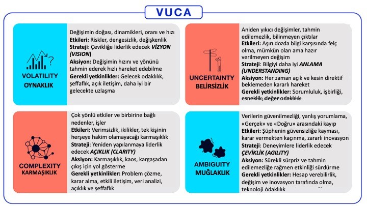 VUCA ise ilk kez 1987 yılında Warren Bennis ve Burt Nanus tarafından dile getirilmişti. Ve bu yaklaşımla, 1980’lerle küreselleşmenin hayatımızın her alanında yaygınlaşmasıyla birlikte, dünyanın geleceğinin nasıl olacağına yönelik resmi çizmişlerdi ve tabi nasıl yönetilmesi gerektiğinin de.